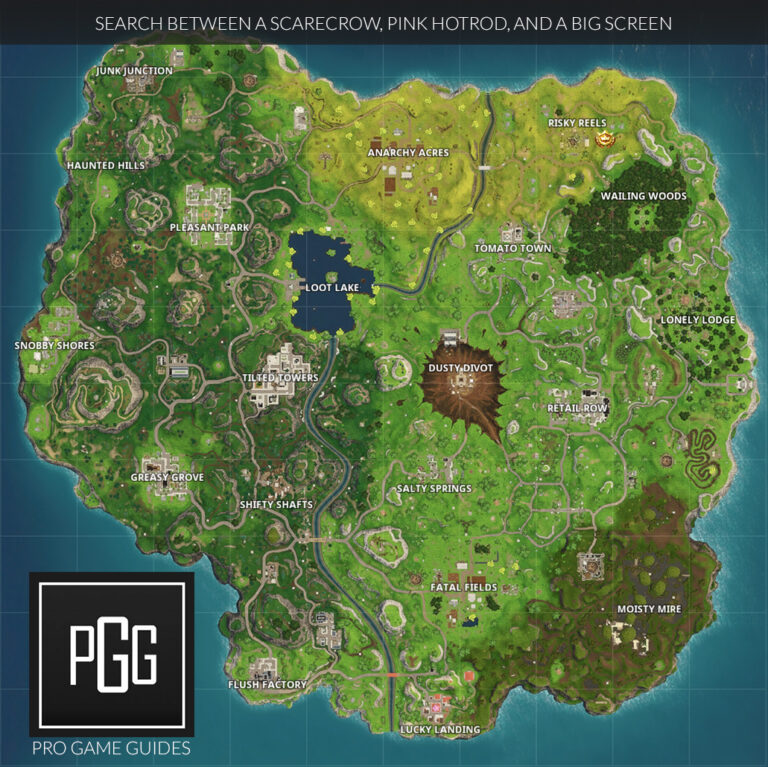 Risky Reels es una nueva ubicación que se ha agregado al mapa durante la temporada 4. Es un área que representa una película autocine de la vieja escuela. Obviamente, hay una pantalla grande aquí, al norte de la pantalla hay un auto rosa y al este hay un espantapájaros. Encontrarás la ubicación del tesoro directamente en el medio de estos tres lugares. ¡Mira el mapa a continuación para conocer la ubicación exacta!