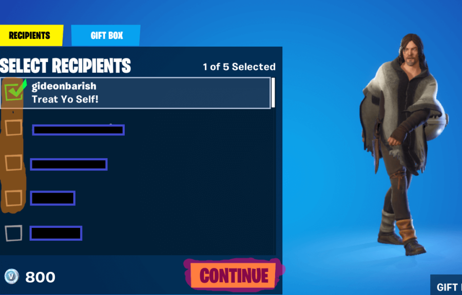 Sabemos; es probable que tenga tantos amigos que simplemente no sepa a quién enviarle el regalo. Sin embargo, una vez que resuelva ese acertijo, haga clic en la casilla de verificación junto a su nombre (resaltado en naranja). Puede seleccionar más de una persona para enviarlo, pero costará más V-Bucks. ¡Ningún artículo sirve para todos aquí! Una vez que haya seleccionado a sus amigos, haga clic en Continuar para ir a la pantalla final.
