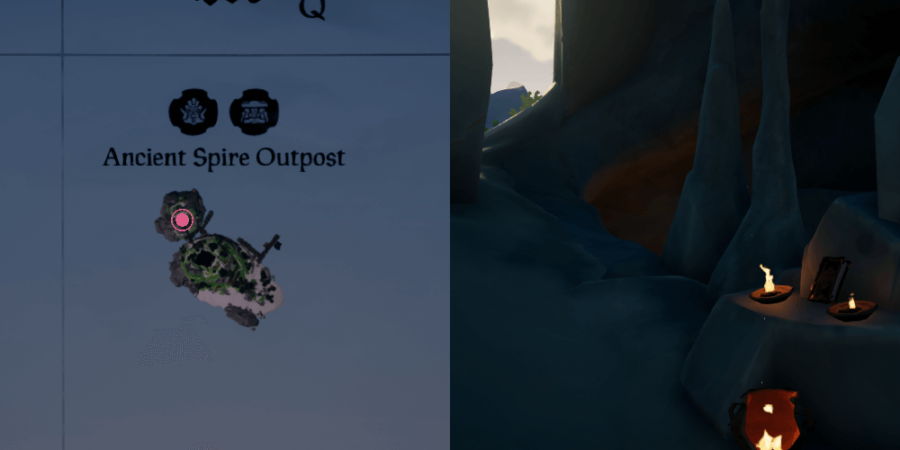 Una vez que hayas llegado a Ancient Spire Outpost, echa un vistazo a la imagen de arriba. A la izquierda, verá la ubicación aproximada del Diario en el mapa. Sin embargo, está dentro de una cueva, ¡así que no vayas a mirar el exterior de la aguja! A la derecha, verá dónde se coloca el Diario en su área.