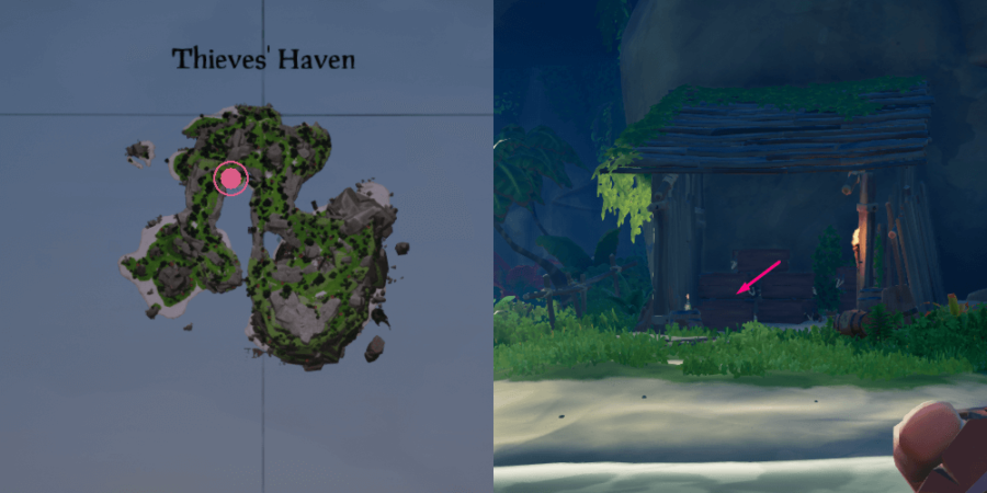 Cuando llegue a Thieves ‘Haven, un pequeño campamento es exactamente lo que buscará encontrar, y se puede ver en la imagen de arriba. A la izquierda, verá la ubicación aproximada del Diario en el mapa. A la derecha, verá dónde se coloca el Diario en su área.