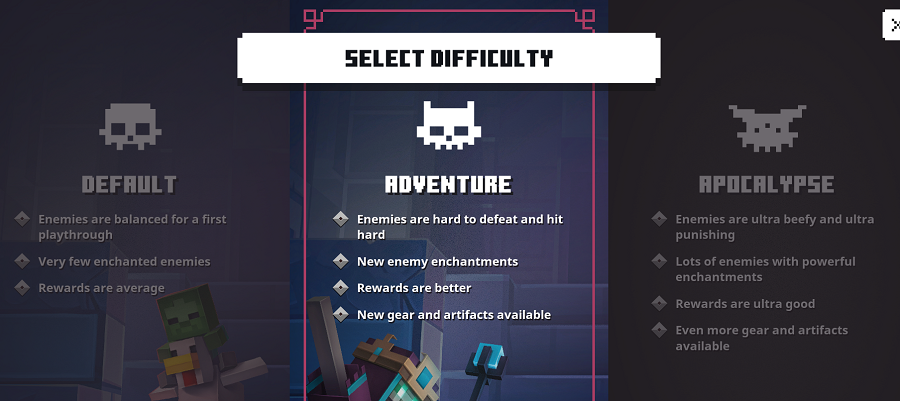 Después de derrotar al Archi-illager y sus hordas de illagers en Obsidian Pinnacle, verás que desbloqueas un nuevo modo en Minecraft Dungeons llamado Adventure Mode. El modo Aventura tiene enemigos más duros y la clasificación de dificultad aumentará drásticamente desde el modo predeterminado. En general, la historia y los niveles siguen siendo los mismos. La mayor diferencia es que los enemigos con los que luchaste antes se han vuelto más poderosos, ¡y las recompensas por despejar mazmorras son mucho mejores!